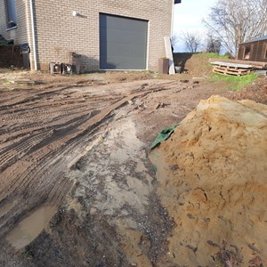 Il s'agit d'une allée de garage en pavés ainsi d'un accès à la porte d'entrée qui est surélevée par rapport au niveau de la route.