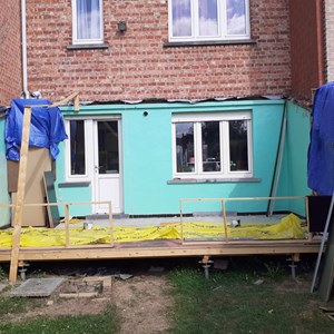 Je voudrais refaire la véranda à l'endroit où il existait déjà. Nous avons déjà enlevé l'ancienne véranda de 18m2 Il faudrait la refaire avec : - la structure en bois -toitures en polycarbonates et pvc - réutilisation de l'ancienne fenêtre et de la porte - faire une chape sur l ensemble et pose de carrelage au sol - finition intérieure en gyproc - face arrière côté voisin devrait être habillée